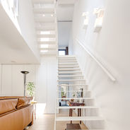 In lage-energiewoningen en volgens het principe van het open plan vermijden we vandaag de dag gangen en hallen liefst, ze nemen veel te veel waardevolle ruimte in beslag. En dus wordt ook deze verticale circulatie mee opgenomen in de gebruiksruimte. Ook op de verdieping met de slaapzones worden de gangen best vermeden. Door ze een weinig te verbreden kunnen we deze anders verloren oppervlakte opnieuw een functie toedichten, zoals werkruimte, polyvalente speelplek of dressing. En zo creëert de trap een connectie tussen leefruimtes beneden en boven, en verbindt ze in plaats van te scheiden.